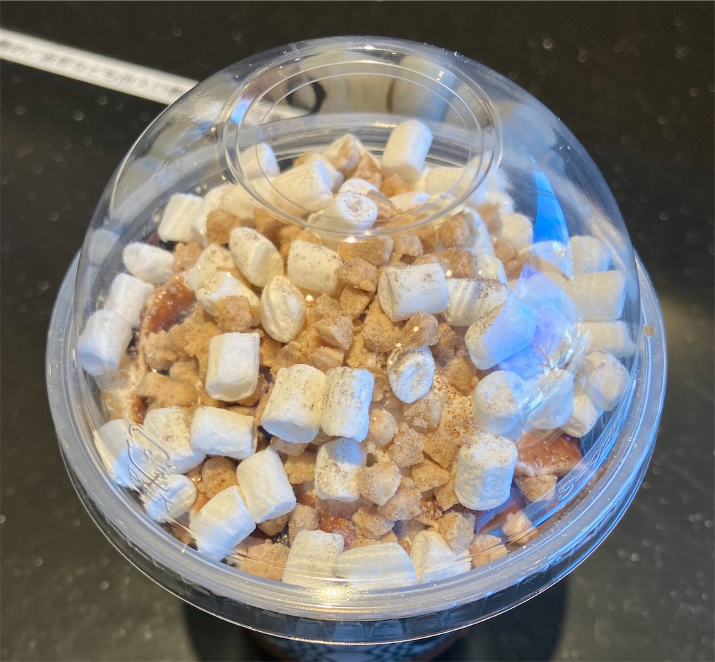 実際に飲んでみると、まず感じるのは しっかりとしたチョコレートの甘さ。 甘党さんには嬉しい濃厚感で、クランチのザクザク、マシュマロのふわふわがとにかく楽しい!